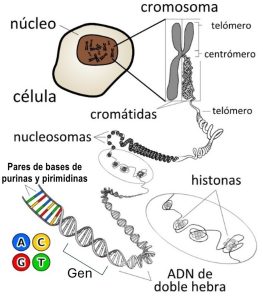 La mayor parte del ADN se encuentra en el núcleo celular, pero no está suelto dentro de las células; se encuentra altamente organizado en estructuras llamadas «cromosomas», que residen en dicho núcleo celular. Los seres humanos tienen 46 cromosomas, organizados en 23 pares. De estos, un conjunto completo proviene de la madre y el otro del padre, lo que explica por qué heredamos características de ambos progenitores.